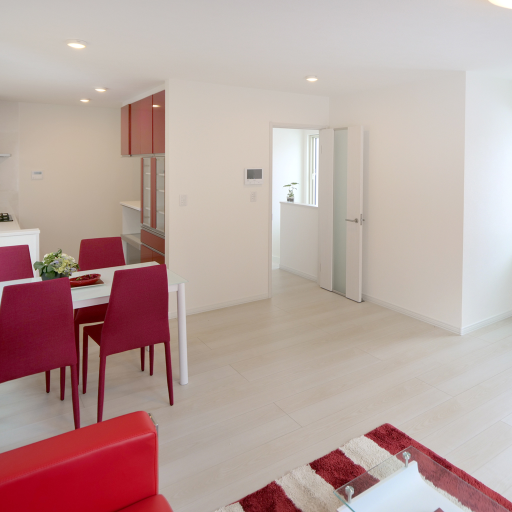 LDKを2階に設定したモデルです。遮光カーテンを開けている日中、外からの目を気にしなくて良いというメリットがございますので、ゆっくりと寛いで頂けます。2階階段付近のホールのクローゼットにはコートなどを収納可能。